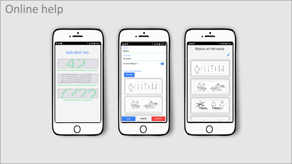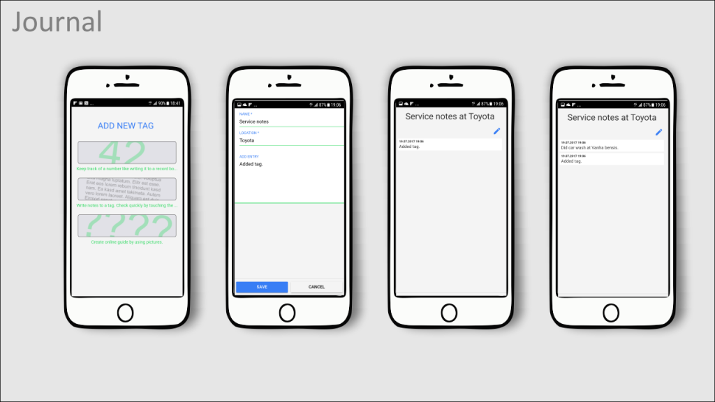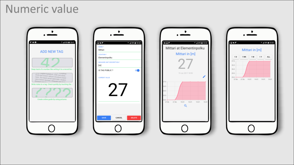 Metatag has 3 different types of information to be used: 1) numbers 2) online pictures and 3) journal. With these users can access online help just touching the tag, report various numerical data (where IoT is not applicable) and write text notes information fast by accessing tag.