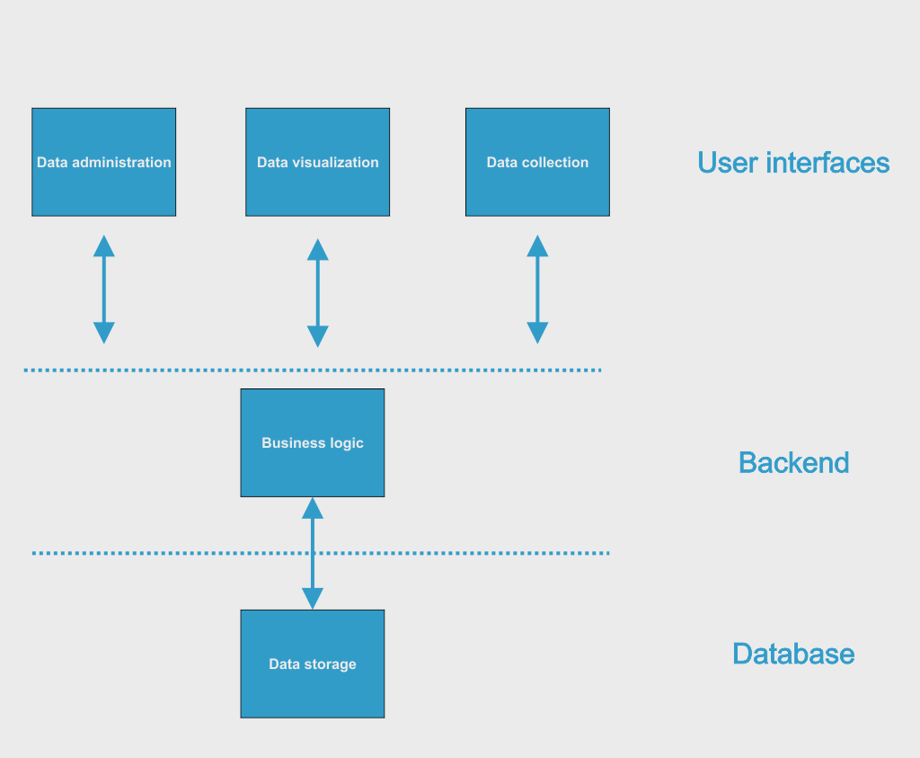 For our meta tag application, data collection happens when unstructured data is read from the nfc tag in form of numbers or images. The application backend provides the business logic by deciding what needs to be done when and where for the gathered data. The structured data is then persisted for use in the database. The user interface defines the data representation and charts and lists are used where appropriate. Our application has some data administration needs like removing tags or users or bulk uploading data. In summary, we have to choose technologies with which we can implement our user interface(s), business logic and data persistence needs. The nature of the application idea defines the user interface needs.